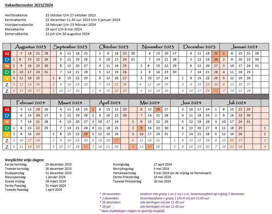 Hier vindt u alle vakanties en vrije dagen in het schooljaar 2023/2024